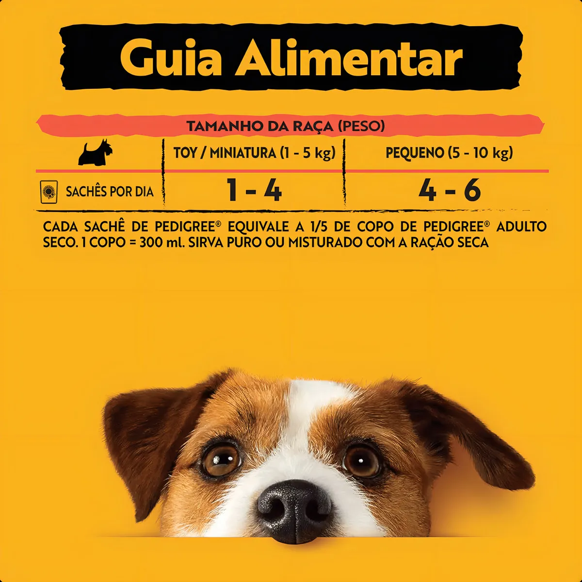 As quantidades podem variar de acordo com a raça, idade e nível de atividade do seu cão. Quantidades orientativas. Ao trocar o alimento do seu cão, faça-o de modo gradual durante um período de transição de 5 a 10 dias. Esta transição é essencial para evitar problemas gastrointestinais. A cada dia, aumente a quantidade até que seu cão seja alimentado exclusivamente com Pedigree® lata.