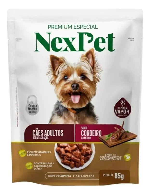 Ração Úmida Premium Especial NexPet Sachê Cordeiro ao Molho para Cães Adultos Todas a Raças 85g cada A Ração Úmida NexPet Sachê Gourmet Cordeiro ao Molho para Cães Adultos é um alimento úmido e balanceado com fonte enriquecida em aminoácidos que repõem as necessidades diárias. Feito com proteínas de qualidade, facilitam a digestão reduzindo o volume e odor das fezes.